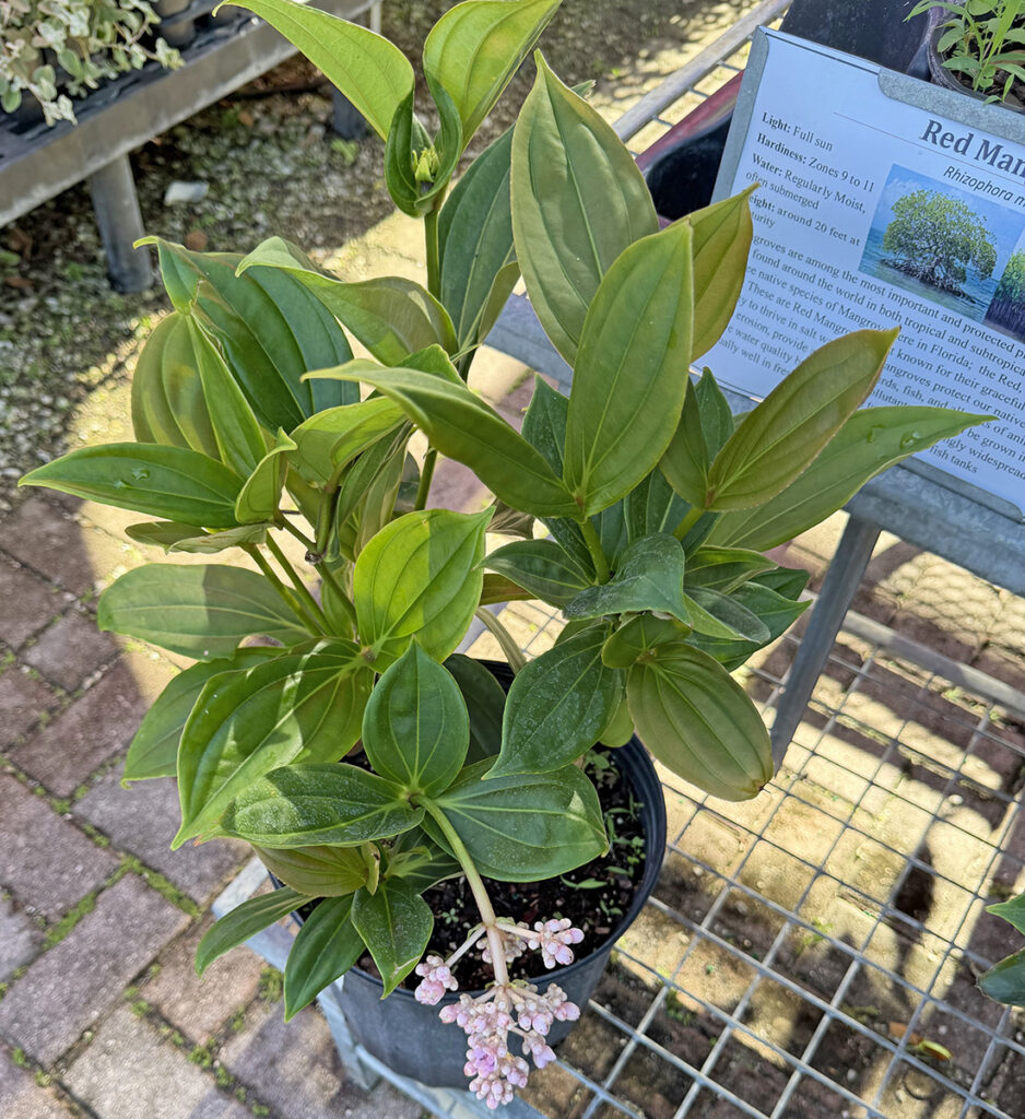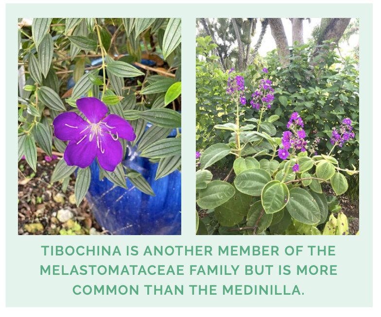 Medinilla is a member of the Melastomataceae family of 5,000+ tropical plants, and the specific genus of Medinilla has 374 recognized species according to the Royal Botanic Garden of Kew. Breaking down this horticultural mouthful, “Mela” comes from the Greek for black, probably referring to its black seeds and “stoma” or mouth for reasons I could not uncover. What truly distinguishes members of this family, though, are its highly distinctive leaves, borne opposite to each other on the stem, featuring three to seven long prominent veins that are described as acrodromous or running to a point, as they all emanate from the leaf base. Another member of this family that may be more familiar with our gardeners are the Tibochinas and if you compare the leaves of the two plants, this trait will be obvious.