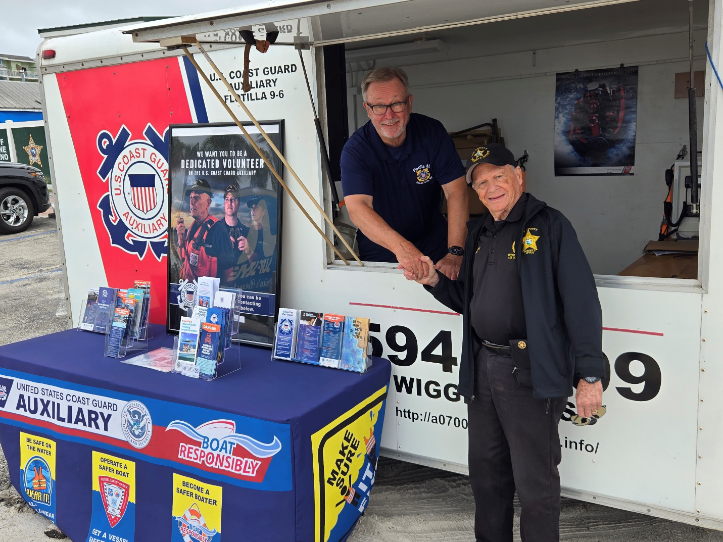 U.S. COAST GUARD AUXILIARY FLOTILLA COMMANDER WALTER DELEVICH (INSIDE) GREETS SHERIFF’S OFFICE OUTREACH COORDINATOR BARRY KURTZ (OUTSIDE) AT THE LEE COUNTY MARINE SAFETY EVENT APRIL 7TH.