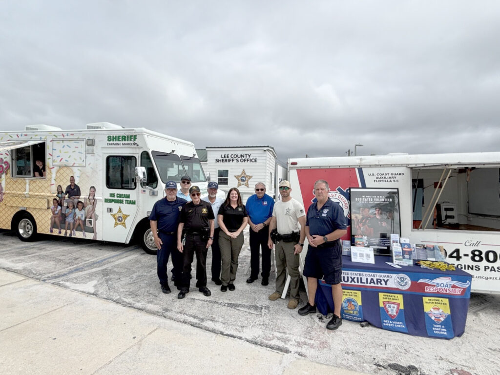 The Wiggins Pass Flotilla of the U.S. Coast Guard Auxiliary gave safe boating tips, and the Lee County Sheriff’s Office offered ice cream at a joint marine safety event on Ft. Myers Beach April 7th. The Flotilla displayed it communications trailer as the sheriff’s ice cream truck provided visitors sweet treats as an incentive to hear messages about water safety.