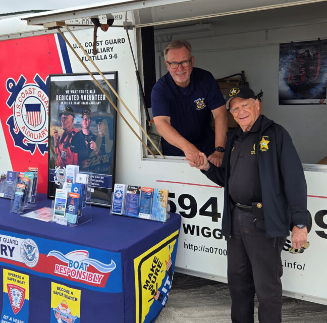 U.S. COAST GUARD AUXILIARY FLOTILLA COMMANDER WALTER DELEVICH (INSIDE) GREETS SHERIFF’S OFFICE OUTREACH COORDINATOR BARRY...